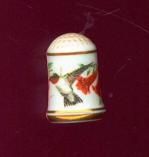 White glazed thimble , slight fluting at rim. Wide gold band at rim with a narrow gold line above. Body has screen print of Rufus Hummingbird taking nectar from red flowers, green leaves. Words ÒArchilochus colubrisÓ in gold. Inside ÒFranklin Porcelain linited Edition Fine Bo ne China Peter BennettÓ