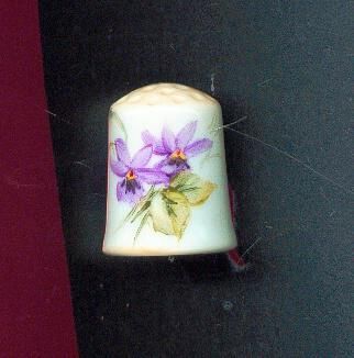 Hand painted porcelain thimble. Unglazed rounded knurled top. Slight fluting at lower edge. Body white, glazed with large bunch of purple flowers and green leaves one side, smaller bunch on reverse. Signed inside in maroon J.D.1981.