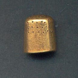 Heavy brass hand crafted thimble . Squat. 3 rows of indentations from top over body of thimble, then plain to lower edge. Top slightly rounded with irregular knurling. No marks.