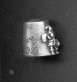 Pewter Christmas thimble. Flat top with cut out candle with holly and berries. On body of thimble added figure of Santa Claus and pack on one side. Incised flower and 'Marry Christmas 1981' on reverse. No marks.