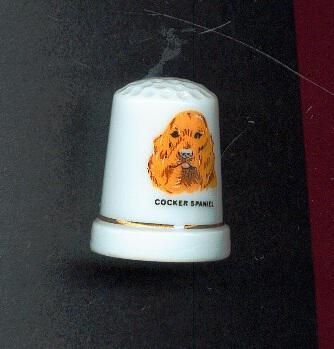 White glazed porcelain thimble with raised rim. Fine gold line at top of rim. Decal of a Cocker Spaniel on body of the thimble with name underneath in black print. Rounded knurled top. No marks.