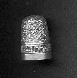 Silver thimble with English hallmarks. Narrow plain rim with hallmarks - 4 (size) RD210798 , Lion passant, Chester 1894 (L) and maker G.V.& Co. Narrow band of waffle pattern above. Body of thimble and over top are fan pattern.