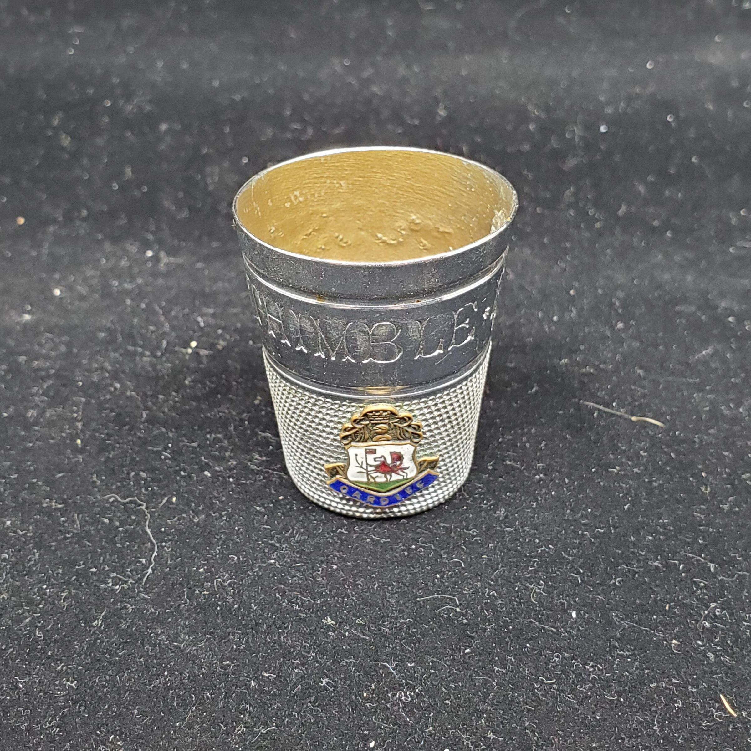 Drinking Measure Thimble .ÓJust A Thimble FullÓ on wide band. RD707065 below the word Full. Knurling from band to and over top(or bottom ?)Coat of Arms of Cardiff, Wales on knurling. ÒCardiffÓ ubderneath on banner.