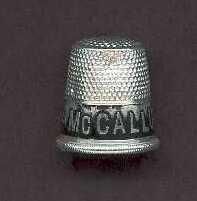 Aluminum advertising thimble with black painted band advertising "Deal at McCallum's". Ribbed rim.