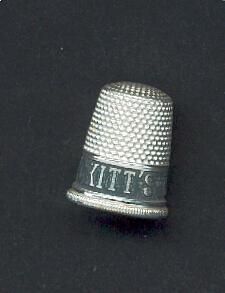 Aluminum advertising thimble with rolled ribbed rim. Wide pale blue band advertising "Reckitt<s Blue" and two small stars.
