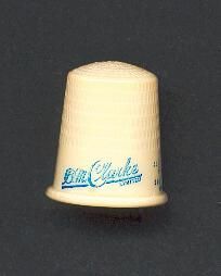 cream colored heavier type plastic with rolled rim. Triangular indentations. Advertising in blue- B.M.Clarke Limited -Gresham Hosiery - Stanfield's Lingerie. Small blue star.