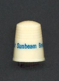 Cream coloured plastics with raised rim. Wide plain band above rim with blue advertising - Reach for Sunbeam Bread . Blue star. Small circle with Printed in U.S.A.