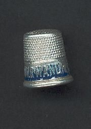 Aluminum thimble,rolled smooth rim.Blue painted band advertisingMcNair Manor Dickinson Gillespie Inc.