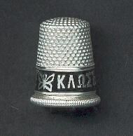 Aluminum thimble with rolled vertically lined rim. Narrow black band above with advertising - Greek letters and a butterfly. Translation is ÒButterfly Brand Sewing ThreadÓ.