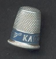 Aluminum advertising thimble with rolled ribbed rim.Advertising on pale blue band in Greek ÒViolin Brand Sewing ThreadÓ and a violin.