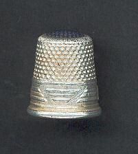 Aluminum advertising thimble with rolled rim. Wide border with ÒMINERVAÕ and a raised designof horizontal lines. Simulated royal blue stone on top.