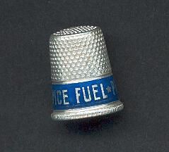 Aluminum advertising thimble with vertical ribbed rim. Blue band with ÒService Fuel Phone 383 and 3 stars. No marks..
