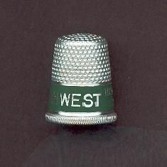 Aluminum advertising thimble with diagonally lined rolled rim. Green band with ÒThe Best John West Middle-Cut SalmonÓ and two stars. Indentations to top and over.