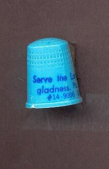 Blue plastic advertising thimble with dark blue printing. ÒServe the Lord with Gladness Ps. .100:2 #14 -9006 CrossÓ.In apex U.S.A. 8.