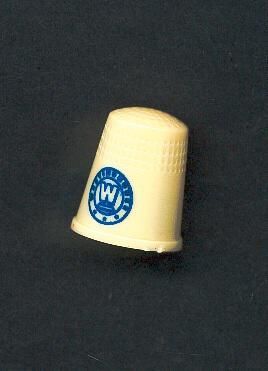 Cream coloured plastic advertising thimble. Logo in blue oval - a large W with Westinghouse around outside. U.S.A. 7 in apex.