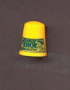 Yellow plastic advertising thimble with green print. Green rectangle with woman and man in corners ÒInstant Shoe RepairsÓ in center. U.S.A. 4 in apex.