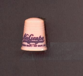 Pink plastic advertising thimble with purple (grape) coloured printing. ÒNu Grape Imitation Grape Not Grape JuiceÓ on band above rim.