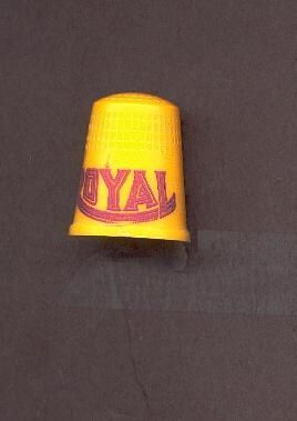 Yellow plastic advertising thimble with maroon printing. ÒROYALÕÓ U.S.A. 7 in apex. Square knurling around and over top.