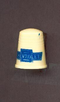 Cream coloured plastic advertising thimble with blue printing. 'CHEVROLET'. U.S.A. 8 in apex.