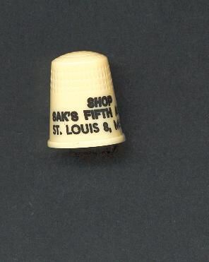 Cream coloured plastic thimble, advertising in black print. ÒShop SakÕs Fifth Avenue St. Louis 8, MissouriÓ U.S.A. 14 in apex.