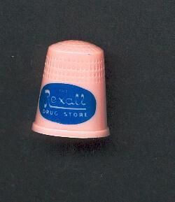 Pink plastic advertising thimble with blue oval logo. Advertisiung :ÓThe Rexall Drug StoreÓ. U.S.A. 4 in apex.