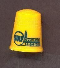 Yellow plastic advertising thimble with dark green printing and logo. ÒGulfÓ in circle plus ÒGulftone LP-Gas Eviame(?) PropaneÓ and a flame. U.S.A. 12 in apex.