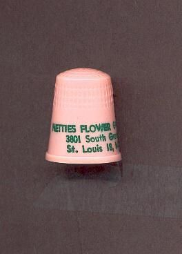 Pink plastic advertising thimble with green printing. Green rose and advertising Ò Netties Flower Garden 3801 South Grand, St, Louis 18 Mo.Ó U. S.A. 3 in apex.