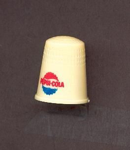 Cream coloured plastic advertising thimble with red and blue logo. Round bottle top ,top red, bottom blue and the words ÒPepsi-ColaÓ in red through the center. U.S.A. 9 in apex.