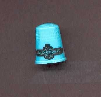 Blue plastic advertising thimble with black logo outline and black printing. Advertising Ò Frigidaire Made only by General MotorsÓ U.S.A.. 7 in apex.