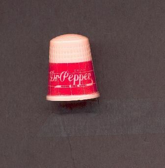 Pink plastic advertising thimble with dark red logo. Large dark red rectangle with advertisingÓDr. Pepper - Good For LifeÓ U.S.A. 17 in apex.