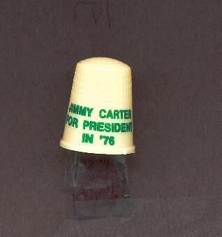 Cream coloured political advertising thimble with green print. Advertising ÒJIMMY CARTER FOR PRESIDENT inÕ76Ó U.S.A.14 in apex.