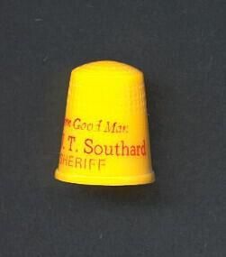 Yellow plastic political advertising thimble with red printing. ÒA Darn Good Man Vote J.T. Southard, Sheriff.Ó