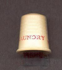 Cream coloured plastic advertising thimble with pink printing. All that is readable is the word 'Laundry*' B&B St. Paul U.S.A. in apex