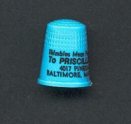 Blue plastic ÒPersonalÓ thimble with black printing. ÒThimbles Mean Fun and Friends To Priscilla Stoffel 4017 Pinedale Drive Baltimore, Maryland 21236Ó