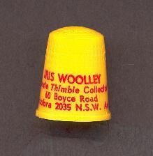 Yellow plastic ÒPersonalÓ thimble with red printing. ÒIr\is Wooley, Aussie Thimble Collector, 60 Boyce Road, Maroubra 2035 N.S.W. Aust.Ó