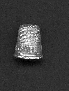 Aluminum advertising thimble with diagonally ribbed rim. Remains of red band just visible. Advertising ÒAsk For Sweet Clover LardÓ Few holes.