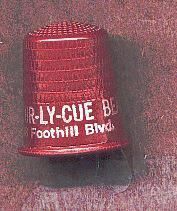 Deep purple plastic advertising thimble. Wide band above rim with white printing, advertising ÒCur-ly-cue Beauty Salon 5288 Foothill Blvd. KE3 -6161*Ó