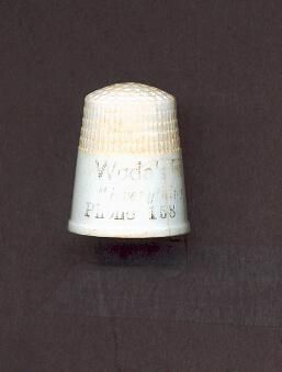 White plastic advertising thimble. Black lettering worn, reads ÒWadas Furniture Store Everything for the Home Phone 158 Vegreville, AltaÓ