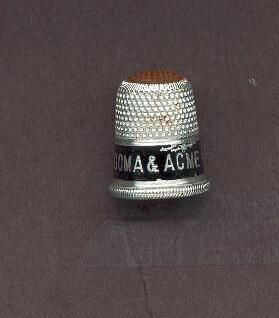 Aluminum advertising thimble with rolled vertically lined rim. Black band above with ÒAlgoma & Acme CleanersÓ Knurling from band to top and over. Simulated yellow stone in top. ÒMade in EnglandÓ inside .