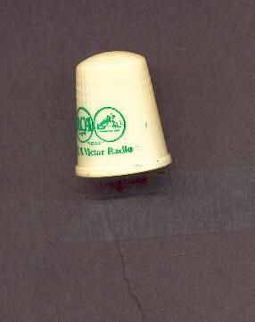 Cream coloured plastic advertising thimble with green printing. Band above raised rim with advertising ÒRCA Victor Radio Ò with logo. Knurilng from band to and over top. Inside apex U.S.A. 10.