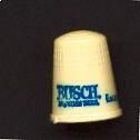 Cream plastic thimble with raised rim. Wide plain band above with blue printing advertising ÒBusch Bavarian Beer EscapeÓ Knurling to and over top. U.S.A. 10 in apex.