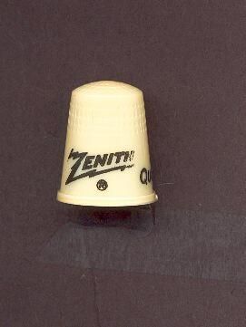 Cream coloured plastic advertising thimble with raised rim. Wide plain band with black printing advertising ÒZenith -R- (R in circle)Quality. Knurling to and over top. U.S.A. 11 in apex.