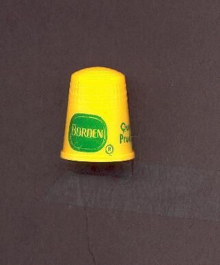 Yellow plastic advertising thimble with raised rim. Wide plain band above witj green printing advertising ÒBorden - R in a circle - Quality ProductsÓ Knurling to and over top. U.S.A. 11 in apex.