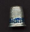 Aluminum advertising thimble with vertically lined rolled rim. Blue painted band, paint chipped, advertising ÒToronto Fuels Ltd. AD7121Ó Made in U.S.A. stamped in apex.