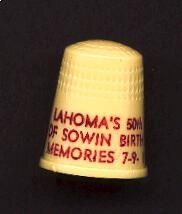Cream coloured plastic thimble with maroon printing. :ÓLahomaÕs 50th year of Sowin Birthday Memories 7-9-1973Ó.
