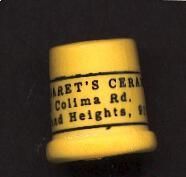 Yellow ceramic advertising thimble, unglazed with wide rolled rim. No indentations anywhere on thimble Advertising in black ÒMargaretÕs Ceramics 18740 Calina Rd. Rowland Heights 91748Õ