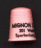 Pink plastic ÒPersonalÓ thimble with raised rim. Black printing ÒMignon S, Jeffords 201 Westminster Dr. Spartanburg, S.C. 29302Ó U.S.A. 16 in apex.