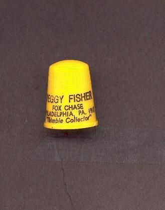 Yellow plastic ÒPersonalÓ thimble with raised rim. Wide plain band above with black printing ÒPeggy Fisher Fox Chase Philadelphia, PA 19111 Thimble CollectorÓ. U.S.A. 16 in apex.