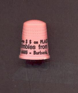 Pink plastic advertising thimble with black printing. AdvertisingÓSave$$ on Plastic Advertising Thimbles from AudreÕ Box 6685 Burbank, Ca 91510Ó U.S.A. 7 in apex.