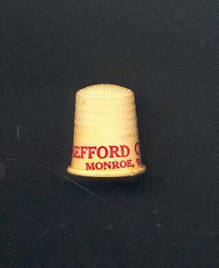Early plastic thimble, yellow, Advertising. Red printing advertising ÒShefford Cheese Monroe, Wis.*Ó In apex B&B St. Paul, U.S.A.